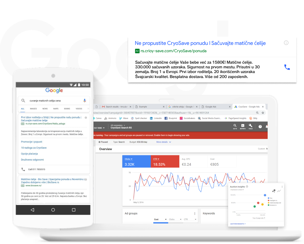 Kompletno smo restrukturirali Google Ads kampanju. Izvršili smo detaljnu analizu tržišta i konkurencije i odabrali narelevantnije i najtraženije ključne reči koje se odnose na uslugu čuvanja matičnih ćelija. Prilagodili smo postojeće i napisali nove oglase, uključujući i kompletan set Google ekstenzija, kako bi bili sigurni da su svi oglasi relevantni i prilagođeni upitima korisnika.